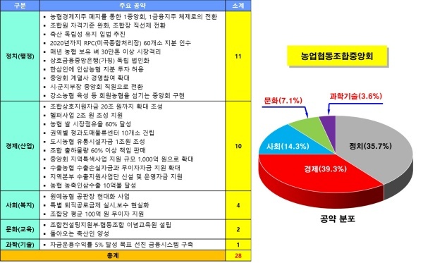 정치(행정) 공약은 △농협경제지주 폐지를 통한 1중앙회, 1금융지주 체제로의 전환 △조합원 자격기준 완화, 조합장 직선제 전환 △축산 독립성 유지 입법 추진 △2020년까지 RPC(미곡종합처리장) 60개소 지분 인수 △매년 농협 보유 벼 30만톤 이상 시장격리 △상호금융중앙은행(가칭) 독립 법인화 △중앙회 계열사 경영참여 확대 △시·군지부장 중앙회 직원으로 전환 △강소농협 육성 등 회원농협을 섬기는 중앙회 구현 등 11개다.