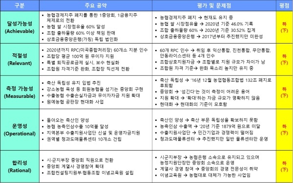 측정 가능성은 공약의 성과를 측정할 수 있는지를 평가하며 축산 독립성 유지 입법 추진, 강소농협 육성 등 회원농협을 섬기는 중앙회 구현, 수출농협 수출손실자금과 무이자자금 지원 확대, 원예농협 공판장 현대화 사업을 확인했다.