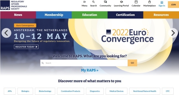 ▲ 약무전문가협회(Regulatory Affairs Professionals Society, RAPS) 홈페이지