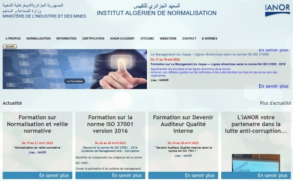 ▲ 알제리 국가표준화기구(Institut Algerien de Normalisation, IANOR) 홈페이지