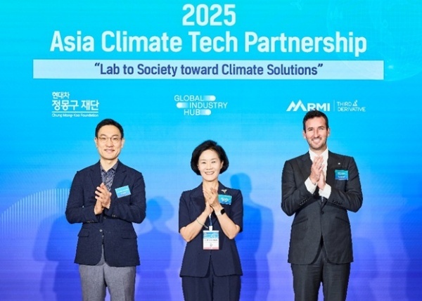 ▲ 2025 아시아 기후기술 스타트업 파트너십 세레모니(왼쪽부터 최재호 현대차 정몽구 재단 사무총장, 클라이밋웍스재단 글로벌인더스트리허브 김효은 대표, RMI·Third Derivative Roy Torbert 총괄) [출처=현대차 정몽구재단]