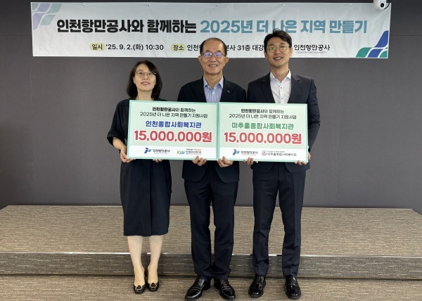 인천항만공사(사장 이경규)에 따르면 2025년 9월2일(화) ‘2025년 더 나은 지역 만들기’ 사업에 참여하는 미추홀종합사회복지관, 인천종합사회복지관에 사업 후원금 각 1500만 원을 전달했다.