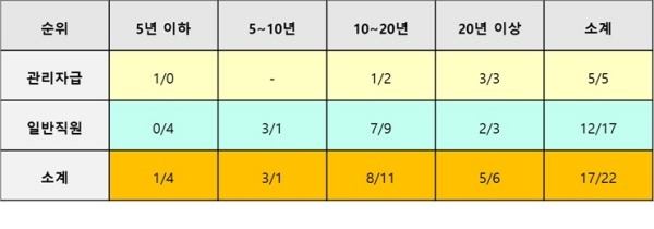 "남자 858명, 여자 634명으로 총 1492명이다. 평균 근속연수는 남자 16.87년, 여자 11.57년이며 평균 14.62년으로 집계됐다."