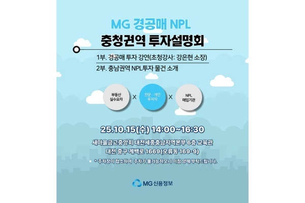 새마을금고중앙회(회장 김인)에 따르면 2025년 10월15일(월) MG신용정보(대표이사 박준철)가 새마을금고중앙회 대전세종충남지역본부에서 '2025년 경·공매 NPL 충청권역 투자설명회'를 개최한다.