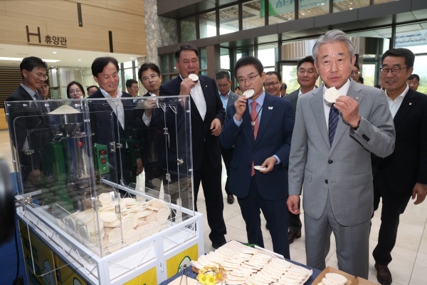 ▲ 2025년 전국에 보급한 우리 쌀 과자 제조기, 실질적인 쌀 소비 증대와 활용 측면에서 좋은 호응을 얻고 있다(오른쪽 부터 쌀과자를 맞보고 있는 강호동 회장과 이철우 경상북도지사) [출처=농협중앙회]