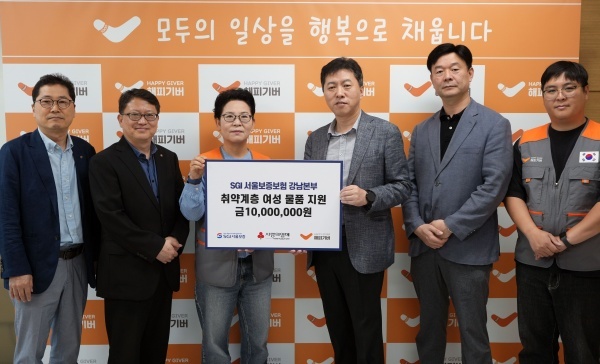 SGI서울보증보험(대표이사 이명순 사장)에 따르면 2025년 9월26일(금) 해피기버 사무국에서 서울강남본부가 취약계층 여성의 건강권 보장을 위해 1000만 원을 기부하며 사회공헌 활동을 이어갔다.