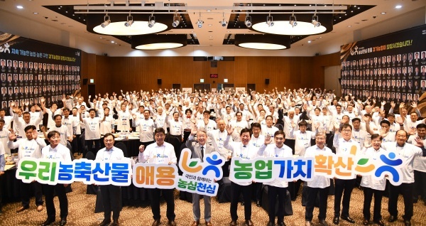▲ 농협, 2025 경기농협 조합장 포럼 참석자들 농심천심운동 추진 결의대회(사진 앞줄 왼쪽에서 네 번째 강호동 농협중앙회장, 다섯 번째 박경식 안산농협 조합장) [출처=농협중앙회]