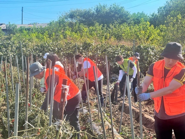 2025년 10월22일(수) 인천광역시 강화군 강화남부농협 관내 농가를 찾은 농산물도매부 20여 명은 NS홈쇼핑, 성남시 자원봉사단체와 함께 고추 지지대 뽑기와 마을 환경정리 작업을 수행하며 일손을 보탰다.