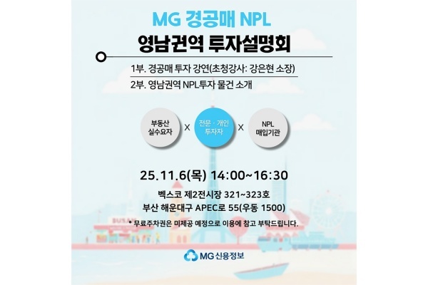 새마을금고중앙회(회장 김인)에 따르면 2025년 11월6일(목) 부산광역시 벡스코 제2전시장에서 새마을금고자회사 MG신용정보(대표이사 박준철)기 ‘2025년 경·공매 NPL 영남권역 투자설명회’를 연다.