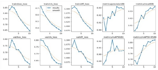 ▲ YOLO 모델 학습 과정에서의 성능 변화와 손실 함수(loss)의 감소 추이 [출처=한국재난정보학회]