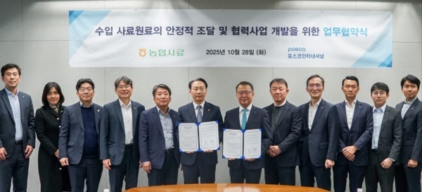 농협중앙회(강호동) 농협경제지주에 따르면 농협사료(대표이사 정종대)가 2025년 10월28일(화) 서울시 강남구 포스코센터에서 포스코인터내셔널(대표이사 이계인)과 국내 식량안보와 축산농가 생산비 절감을 위한 「수입사료 원료의 안정적 조달을 및 협력사업 개발 업무협약(MOU)」을 체결했다.
