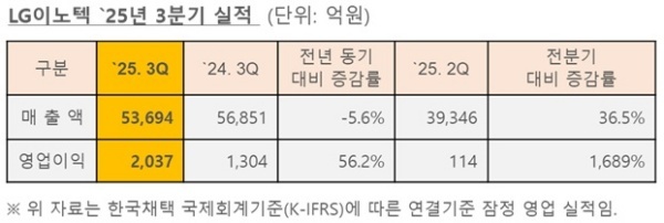 LG이노텍(대표 문혁수)에 따르면 한국채택 국제회계기준(K-IFRS)으로 2025년 3분기 매출은 5조3694억 원으로 전년 동기 대비 5.6퍼센트(%) 감소했으나 전분기 대비 36.5% 증가했다. 반면 영업이익은 2037억 원으로 전년 동기 대비 56.2%, 전분기 대비 1689% 각각 확대됐다.