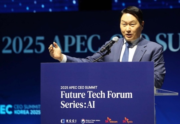 ▲ 10월28일 경북 경주시 경주엑스포대공원 문무홀에서 열린 ‘퓨처테크포럼 AI’에서 ‘AI 생태계 구축’을 주제로 환영사를 하고 있는 최태원 SK그룹 회장 [출처=SK그룹]