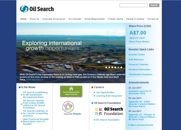 파푸아뉴기니(Papua New Guinea, PNG) 석유가스탐사기업 오일서치(Oil Search)의 자료에 따르면 2016년 12월 분기 총 매출액은 12% 증가해 $A 4억5630만 달러를 기록했다.