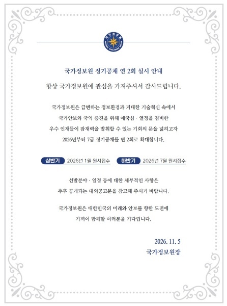 국가정보원(원장 이종석, 이하 국정원)에 따르면 2025년 11월5일(수) 2026년부터 국정원 7급 정기공채를 연 2회 실시 하기로 했다고 밝혔다.
