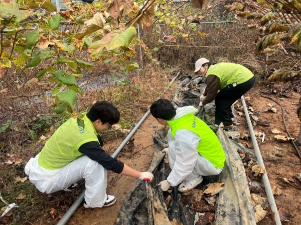 ▲ 디지털경제부 직원들은 10월31일 인천 강화 관내 농가에서 포도밭 비닐 정리 작업을 실시했다 [출처=농협경제지주]