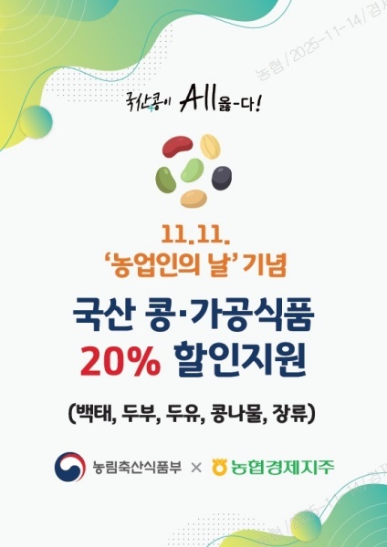 농협경제지주, 2025년 11월26일(수)까지 국산 콩 소비 확대를 위한 할인행사 실시
