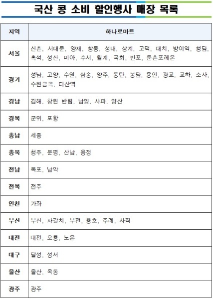 ▲ 국산 콩 소비 할인행사 매장 목록 [출처=농협경제지주]