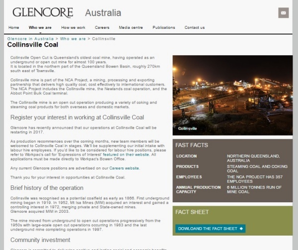 스위스계 글로벌 광산기업 글렌코어(Glencore)의 자료에 따르면 글렌코어 오스트레일리아(Glencore Australia)가 노스퀸즐랜드 소재 콜린스빌 석탄광산을 재개하기 위해 근로자를 모집 중이다.