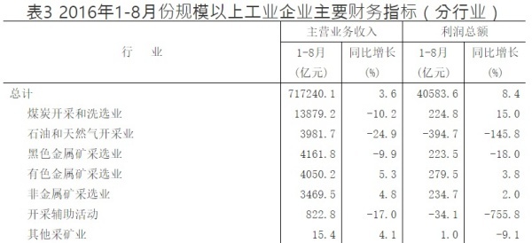 중국 국가통계국(国家统计局)에 따르면 2016년 1월~8월 규모이상석탄채굴기업의 매출액은 1조3879억 위안으로 전년 동기 대비 10.2% 감소했다. 또한 1월~8월 이윤총액은 224억8000만 위안으로 전년 동기 대비 15% 증가했다.