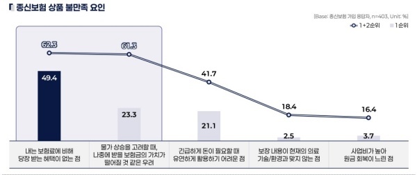 응답자 중 절반(49.4퍼센트(%))은 종신보험의 가장 큰 불만으로 ‘당장 받는 혜택이 없다’고 답했다. 이어 ‘보험금의 가치 하락’(23.3%), ‘유연하게 활용하기 어려운 점’(21.1%) 등의 순으로 나타났다.