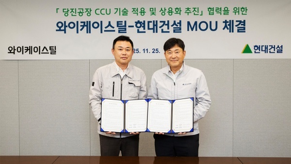 현대건설(대표이사 이한우)에 따르면 2025년 11월25일(화) 서울특별시 종로구에 위치한 계동 본사에서 와이케이스틸(YK Steel)과 ‘당진공장 탄소 포집 및 활용(Carbon Capture & Utilization, CCU) 기술 적용 및 상용화 추진’ 협력을 위한 업무협약(MOU)을 체결했다.