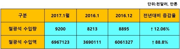 2017년 1월 철광석 수입액 $US 69억6712만3000달러로 전년 동월 수치보다 88.8% 급증