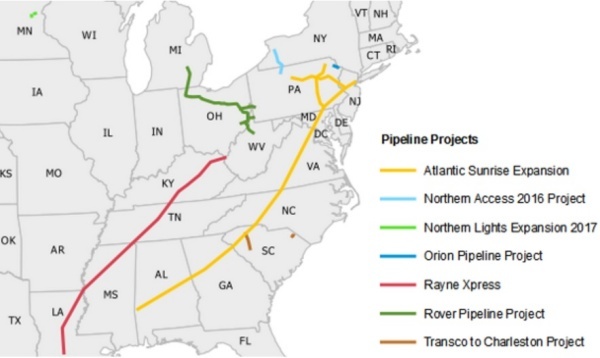 2017년에 승인된 Utica 셰일층으로 부터 천연가스를 생산하는 로버 파이프라인 프로젝트(Rover Pipeline Project)와 Marcellus 셰일층으로 부터 천연가스를 생산해 내는 아틀란틱 선라이즈 파이프라인 프로젝트(Atlantic Sunrise Pipeline Project)가 있다.