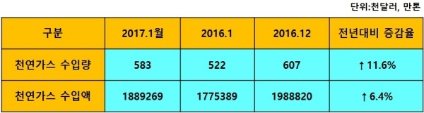 2017년 1월 천연가스 수입액 $US 18억8926만9000달러로 전년 동월보다 6.4% 늘어