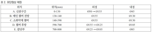 마지막으로 탄도의 안정성을 검증하기 위해 표 2와 같은 수치를 사용했다. 이론적 검증을 위해 소약약제로 치환된 포탄에 대해 소화 약제 무게, 총 질량, 무게중심 등을 산정한 뒤 포탄의 탄도분석을 시행했다.