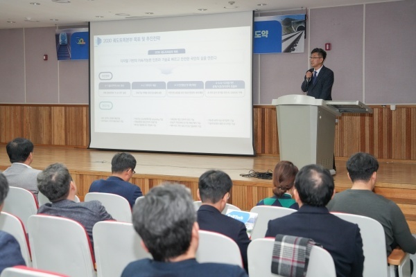 ▲ 개회사에서 2030 궤도토목본부 목표 및 추진전략을 발표하고 있는 최일윤 철도연 궤도토목본부장 [출처=한국철도기술연구원]