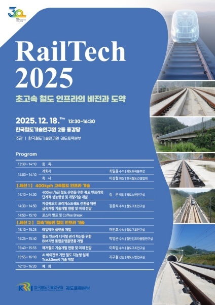 한국철도기술연구원(이하 철도연, 원장 사공명)에 따르면 2025년 12월18일(목) 철도연 본원 2동 중강당에서 「레일테크(RailTech) 2025」를 개최했다. 궤도토목 분야 연구개발 성과와 기술 로드맵을 발표했다.