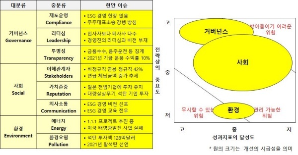 △거버넌스(Governance·지배구조)=거버넌스는 ESG 경영을 도입하고 경영위원회를 운영하고 있지만 경영 헌장조차 제정하지 않아 개선의 시급성이 크다고 평가했다.