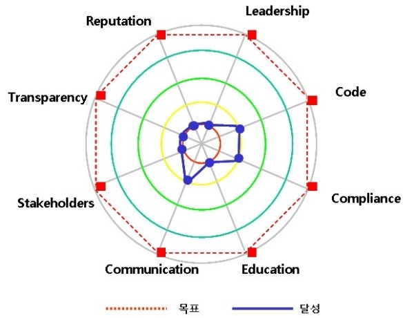 지금까지 진단한 내용을 바탕으로 ‘8-Flag Model’로 측정한 공무원연금공단의 윤리경영 성취도를 종합하면 위의 그림과 같다.