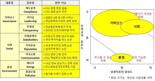 △거버넌스(Governance·지배구조)=거버넌스는 ESG경영위원회는 구성하고 다양한 추진 임무를 제시했지만 구체적인 성과는 미진해 개선이 시급하다고 평가했다.