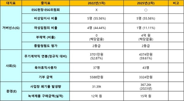 ◇ 2022년 1차 & 2025년 2차 평가 비교... 거버넌스에서 여성임원·종합청렴도 '보통 이하'로 평가