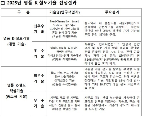 ▲ 2025년 명품 K-철도기술 선정결과 [출처=한국철도기술연구원]