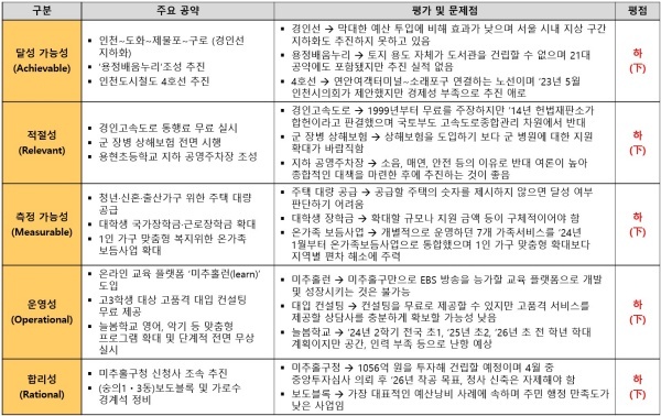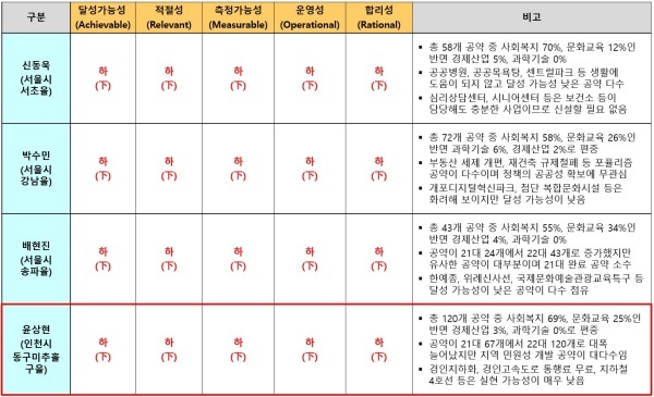 윤상현 후보가 제시 120개 공약은 △달성가능성 △적절성 △측정가능성 △운영성 △합리성 영역 등 5개 영역 모두 최하인 하(下) 평점을 받았다.