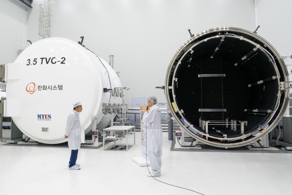 ▲ 한화그룹 김승연 회장이 한화시스템 제주우주센터 내 진공상태, 극저온(-180℃), 극고온(150℃) 환경을 모사한 우주환경 시험장을 살펴보고 있다 [출처=한화그룹]