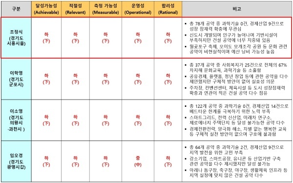 조 의원이 제시한 78개 공약은 △달성가능성 △적절성 △측정가능성 △운영성 △합리성 등 5개 영역에서 모두 최하인 하(下) 평점을 받았다.