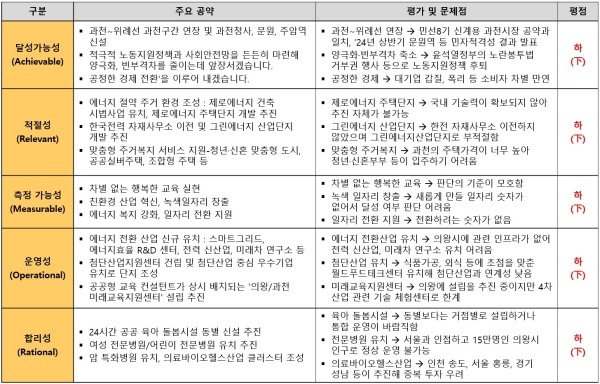 이 의원이 제시한 37개 공약은 경기도 군포시 이학영 의원과 마찬가지로 달성가능성 △적절성 △측정가능성 △운영성 △합리성 등 5개 영역 최하인 하(下) 평점을 받았다.