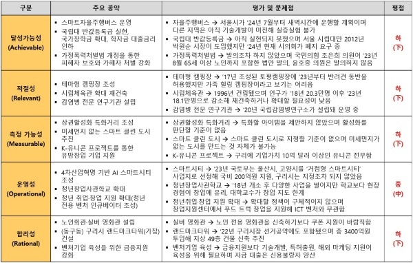평가방법은 국가정보전략연구소(국정연)가 개발한 ‘오곡(五穀)밸리혁신(5G Valley Innovation)-선거공약(ARMOR)’ 평가 모델을 적용했다.