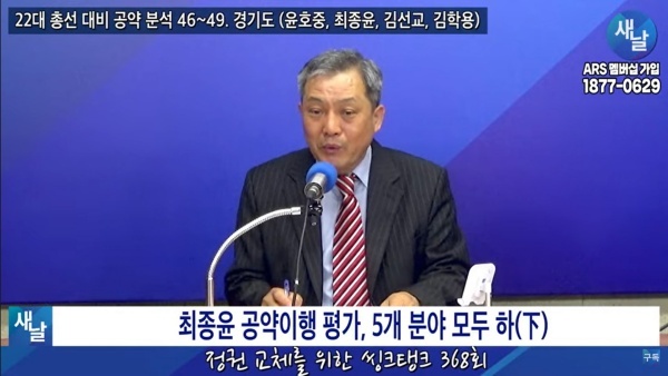 2024년02월06일(화요일) 새날 유튜브 방송은 2020년 21대 국회의원 선거에서 당선된 경기도 하남시 최종윤 의원이 제시한 선거공약을 평가했다. 평가를 위한 방송에는 푸른나무, 이상구 원장, 민진규 소장(국가정보전략연구소)이 출연했다.