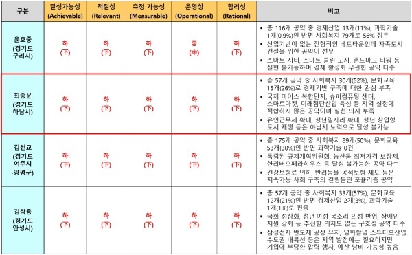 최 의원이 제시한 57개 공약은 △달성가능성 △적절성 △측정가능성 △운영성 △합리성 등 5개 영역 모두 최하인 하(下) 평점을 받았다.