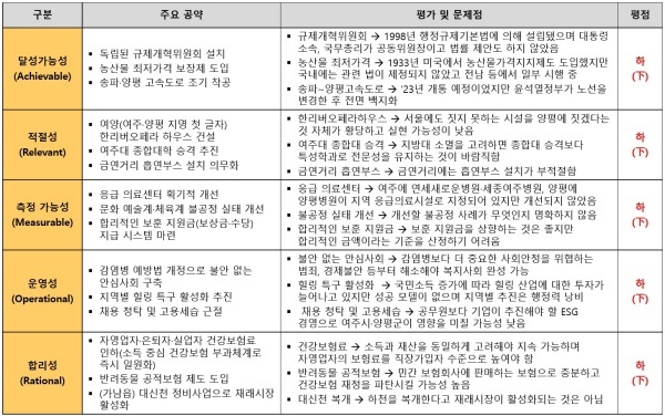 김 의원이 제시한 175개 공약은 △달성가능성 △적절성 △측정가능성 △운영성 △합리성 등 5개 영역 모두 최하인 하(下) 평점을 받았다.