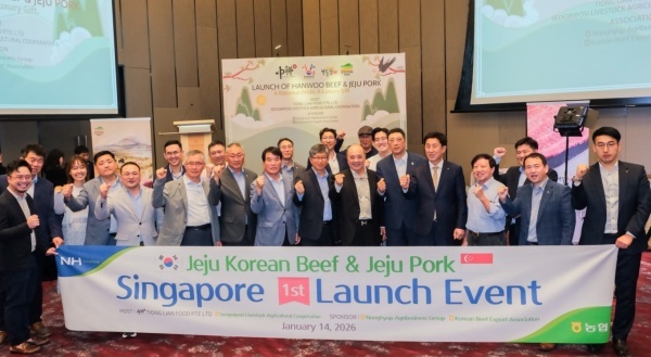 농협중앙회(회장 강호동)에 따르면 농협경제지주(축산경제대표이사 안병우)가 2026년 1월14일(수) 싱가포르 Sheraton Towers 컨벤션홀에서 제주 축산물의 본격적인 첫 수출을 알리는 「싱가포르 첫 수출 이벤트」를 성공적으로 개최했다.