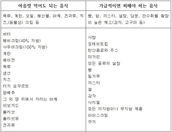 - 이런 것은 되고 이런 것은 않된다고 음식을 가릴 필요는 없지만, 원칙적으로 탄수화물이 들어간 것은 줄이고, 지방이 들어간 음식은 늘리는 것이 방법입니다. 지방이 없다면 우리 몸에 호르몬과 신호전달 물질을 만드는데 어려움이 있을 것입니다. 또한 지방은 콜레스테롤과 함께 체세포 주변을 둘러싸는 막의 중요한 성분입니다.
