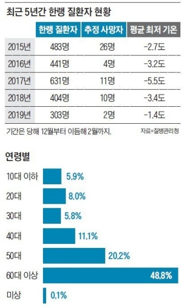 - 그해 겨울의 평균 최저 기온에 따라 한랭질환자와 추정 사망자 숫자가 변화가 있습니다. 질병관리청은 매년 12월부터 이듬해 2월까지 ‘한랭 질환 응급실 감시체계’를 통해 전국 약 500곳 협력 응급실에서 신고받은 (동상과 저체온증 등)한랭 질환자 현황을 공개하고 있습니다.