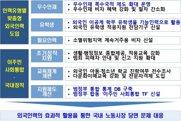 - 우선 외국의 우수 인재는 귀화 장려 및 체류·정착 지원을 하기로 했습니다. 우수인재 유치를 위해 ‘우수인재 복수국적 제도’를 올해 하반기부터 확대 운영합니다. ▶(대상 분야 확대) 4개 분야(과학·인문·학술, 문화예술·체육, 경영·무역, 첨단기술) → 10개 분야(저명인사, 기업 근무자, 원천기술·지재권 보유자 등 추가) ▶(가점제 신설) 경력·소득요건 등이 부족해도 국익 기여 등 가점이 있으면 신청가능입니다.
