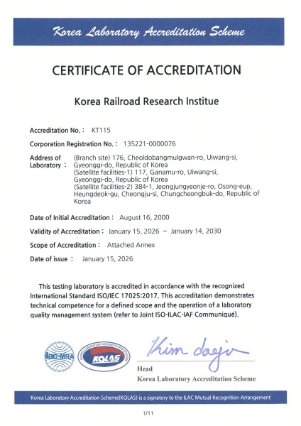 특히 철도연은 2000년 KOLAS 공인시험기관 최초 인정 이후 27년째 국제공인시험기관 자격을 지속적으로 유지해왔다. 철도차량 및 철도용품 시험·인증 분야에서 국가 공공시험기관으로서의 신뢰성과 전문성을 공고히 해왔다.